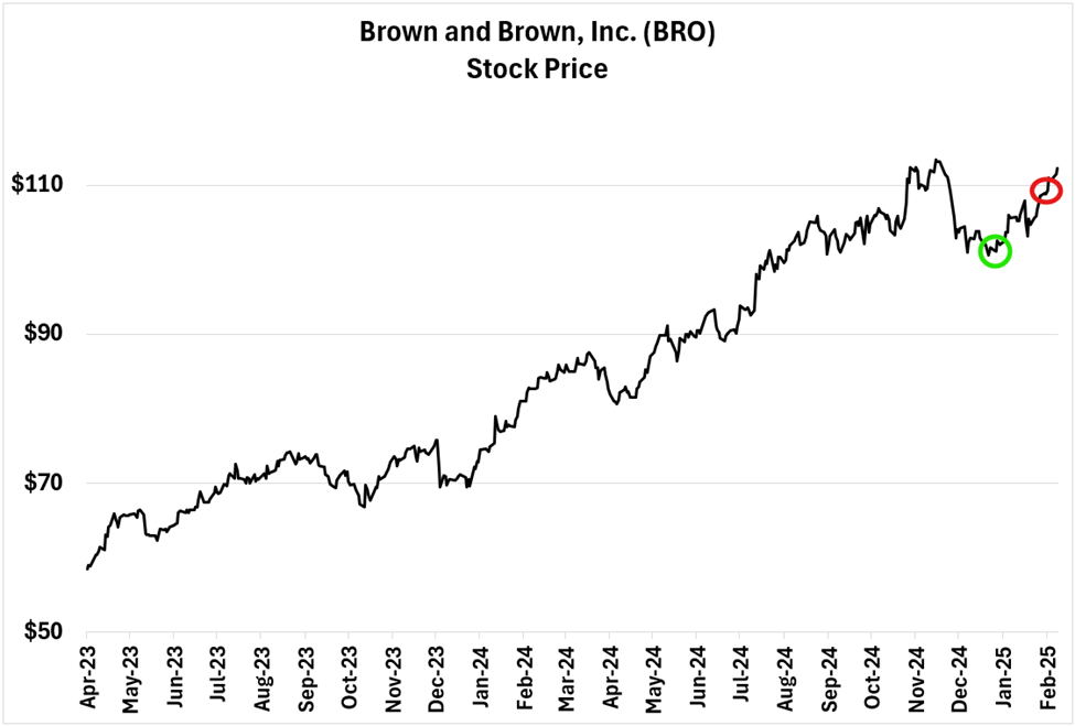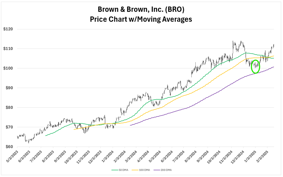 With high-quality companies — and ones where the stock is in a well-established uptrend like BRO — buying after it trades below this level is a high-probability bet.