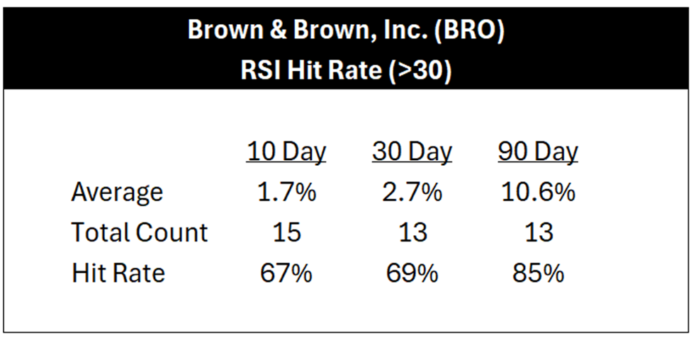 I then go back to see how the stock performed in the past when it triggered this RSI “buy” signal. Here is the data for BRO.