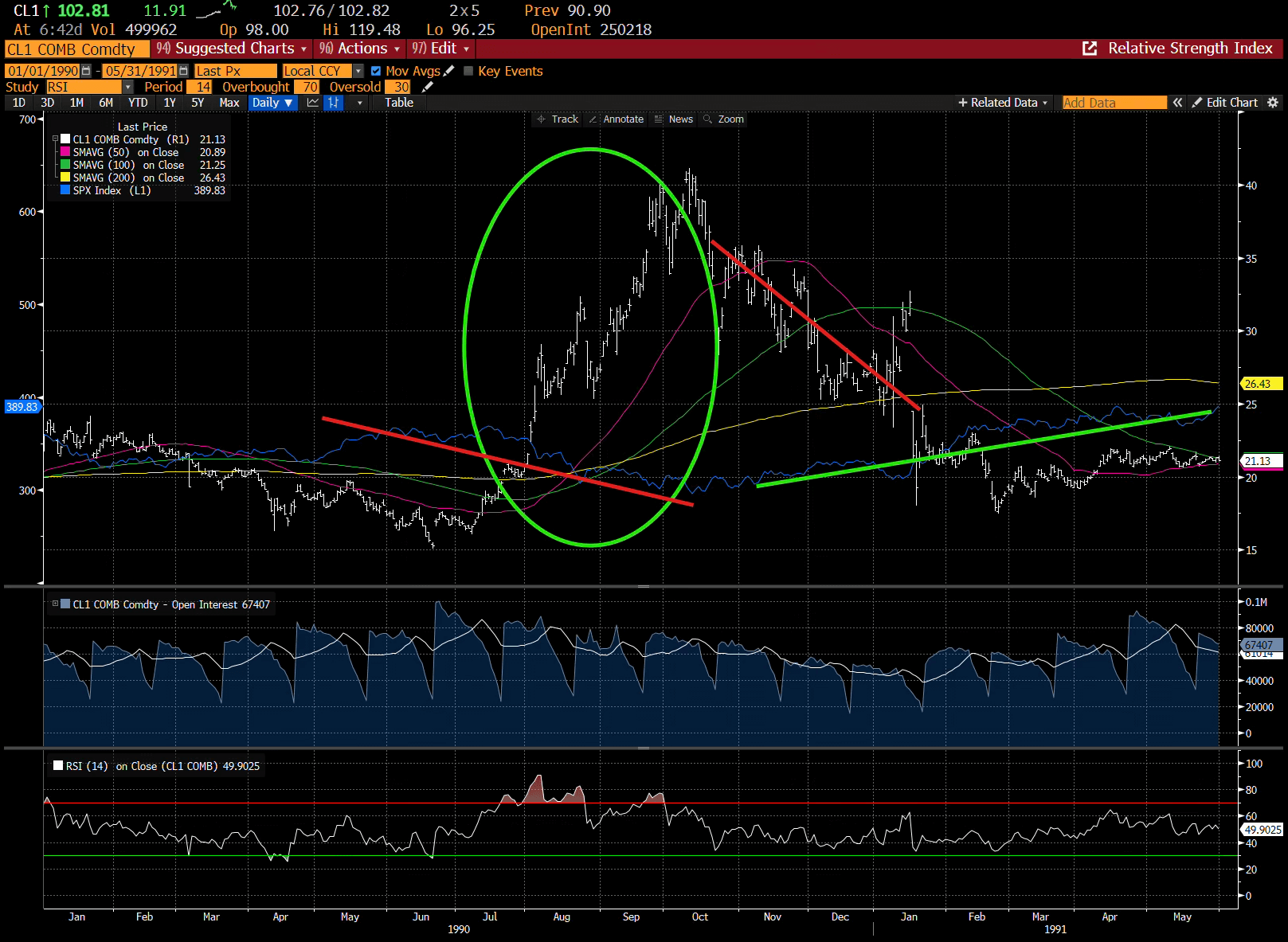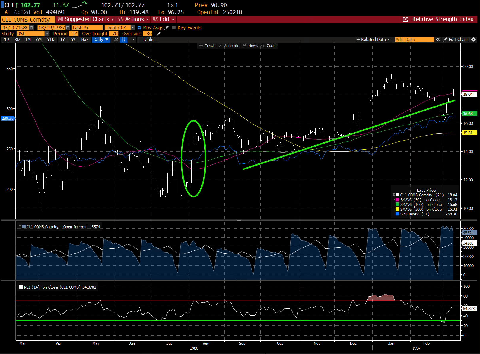 This instance is similar to the move in 1986, since oil prices spiked after declining dramatically for the previous six months.