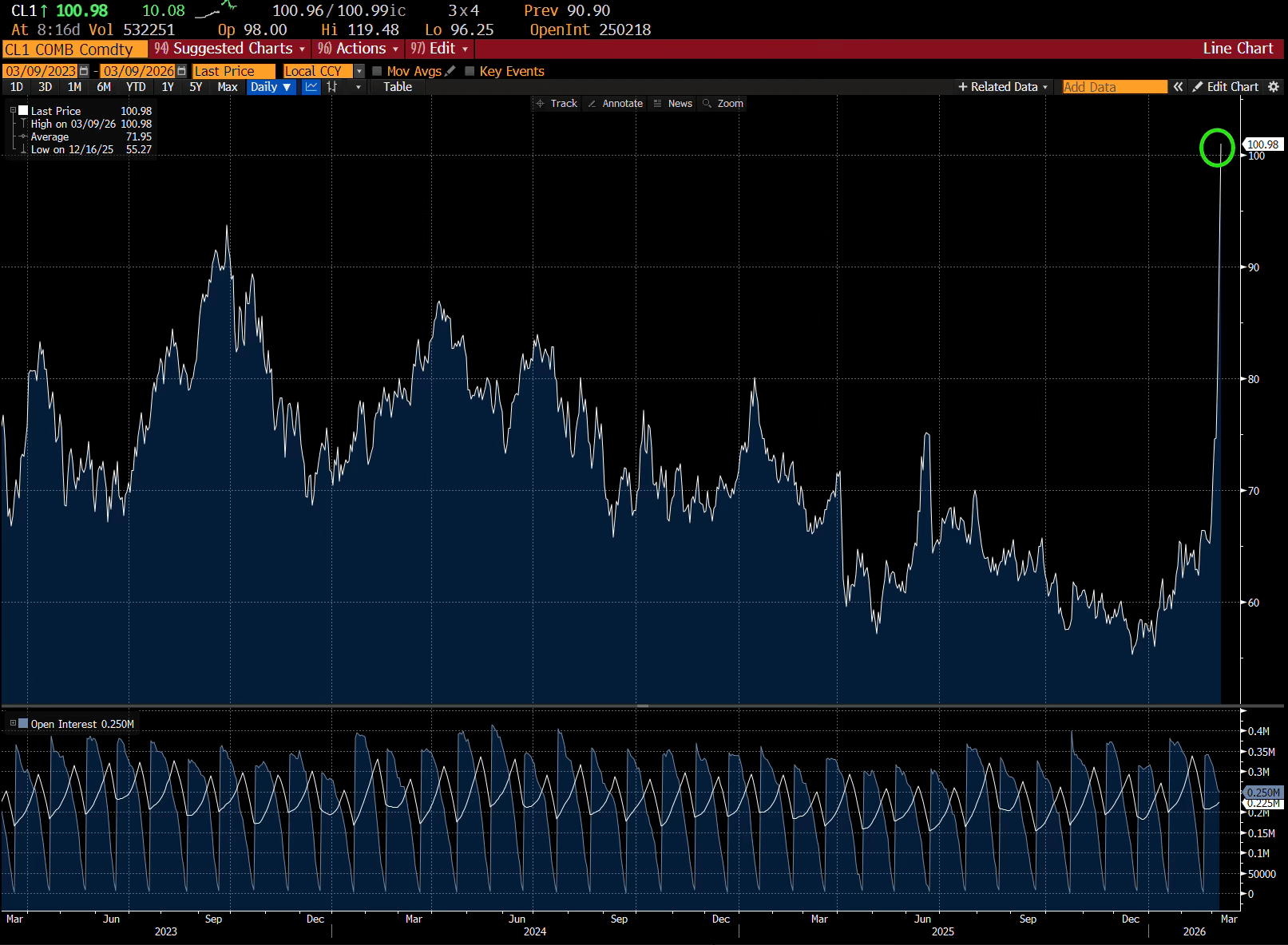 Crude shot up above $100 a barrel over the weekend, 50% higher than two weeks ago and almost double the December low.