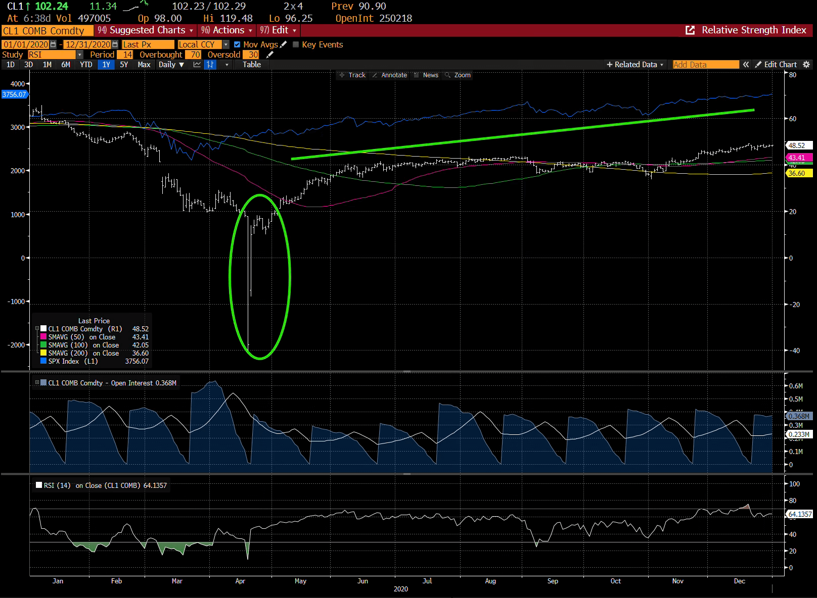 Oil had been going down with risk assets heading into the COVID collapse. Crude oil futures were then hit with some technical factors that drove the price below $0.
