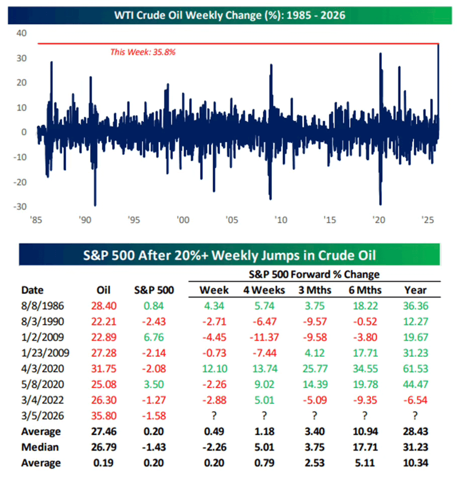 Here’s a table from Bespoke Investment Group showing every time that oil prices have gone up at least 20% in one week since 1985.