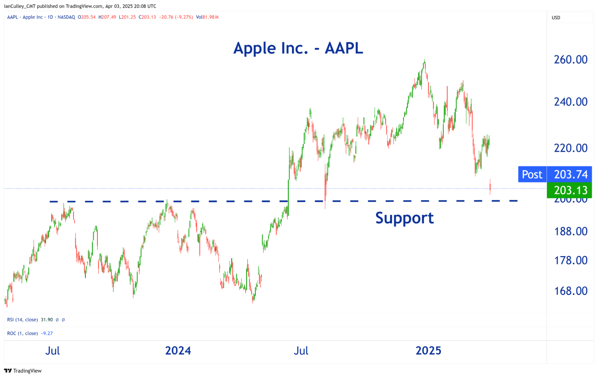 AAPL shares hit the skids Thursday, dropping nearly 10% as we wait to see how the China tariffs will play out. The stock had its worst-performing day since 2020, dropping toward seven-month lows.