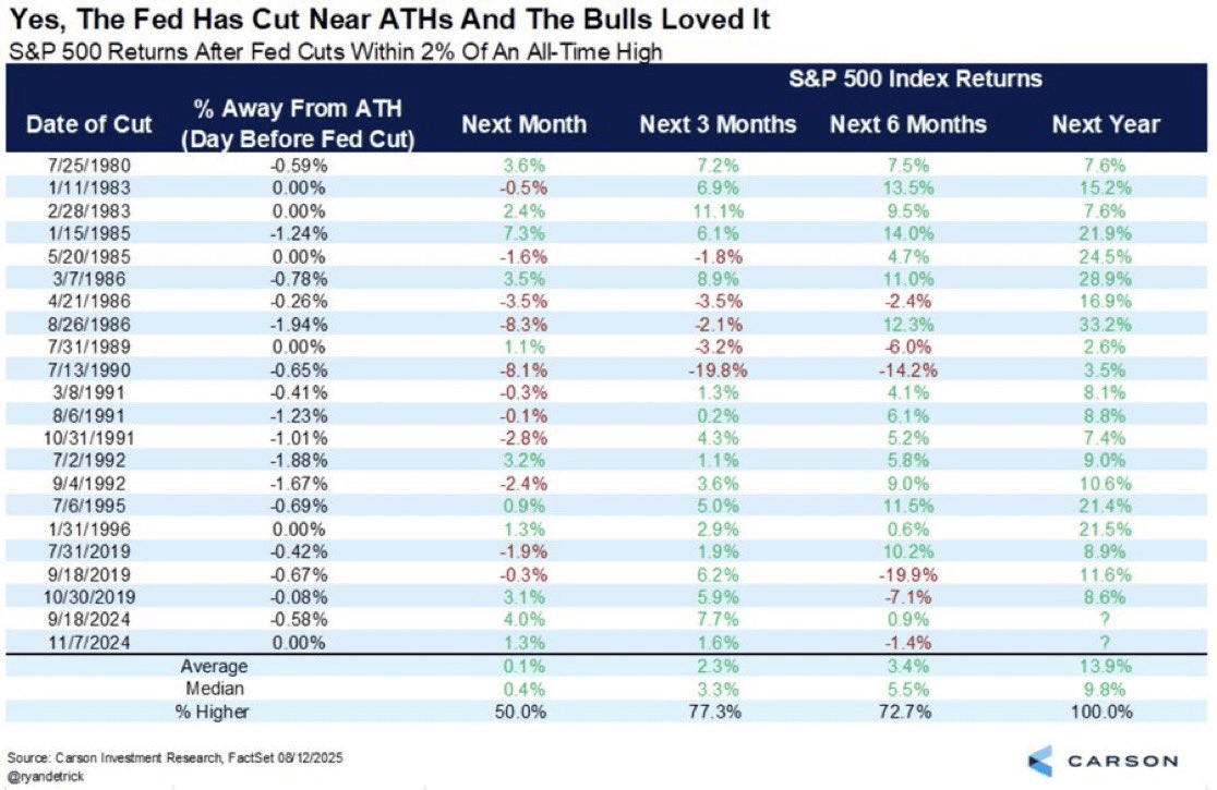 He shared this table showing what has happened to the S&P 500 after the Fed cuts near all-time highs.