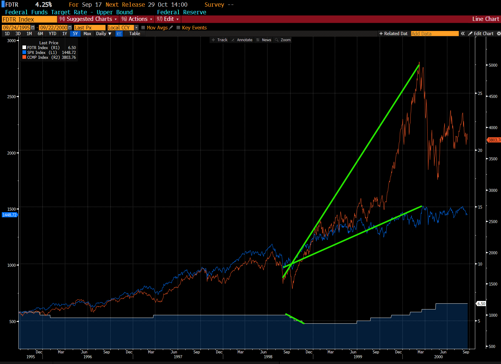 Today’s market reminds me of another time that the Fed was cutting interest rates relatively close to all-time stock market highs — late 1998.