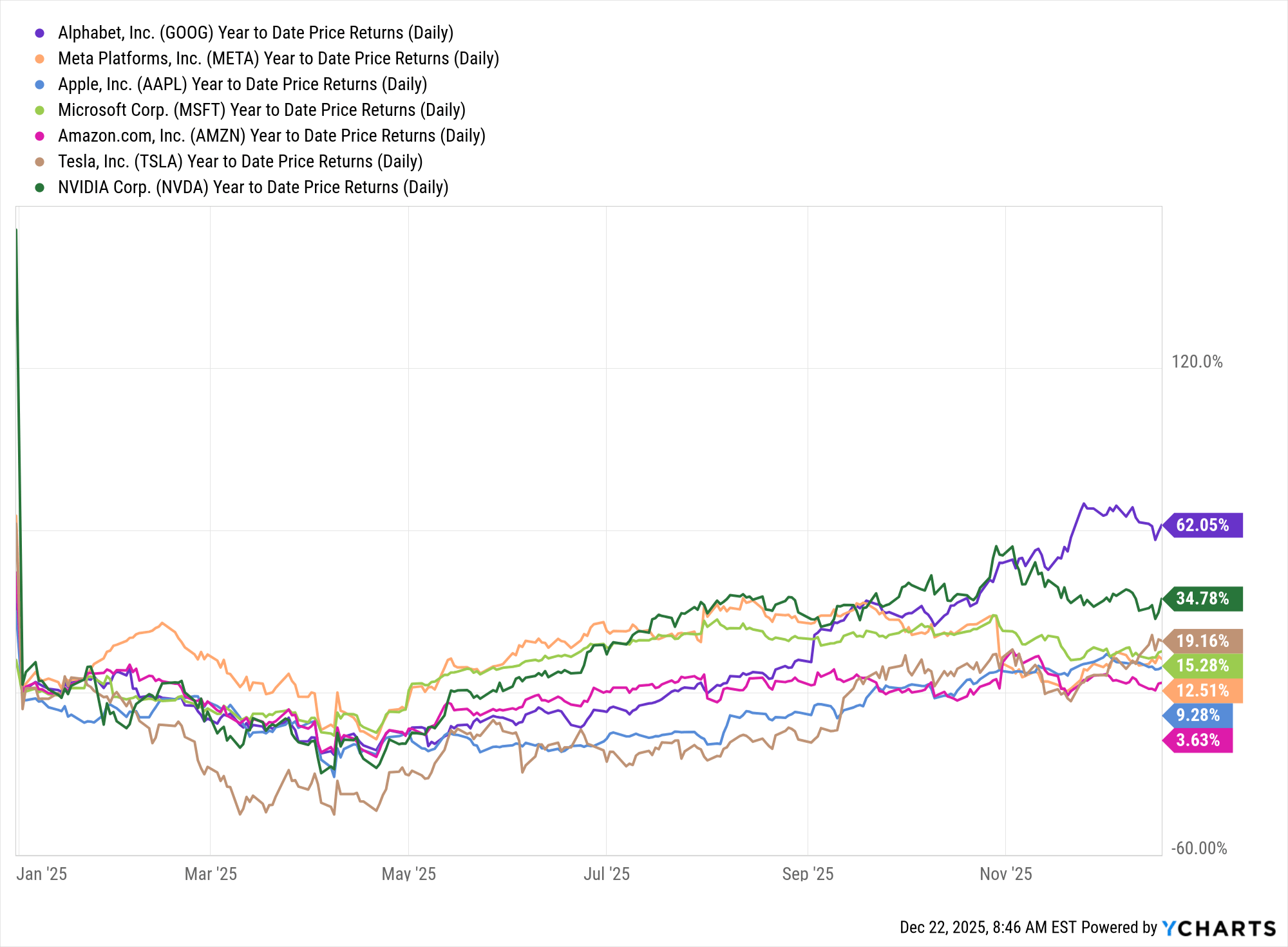 Well, the year isn’t over yet. But here’s a snapshot of how the Mag 7 are doing right now.