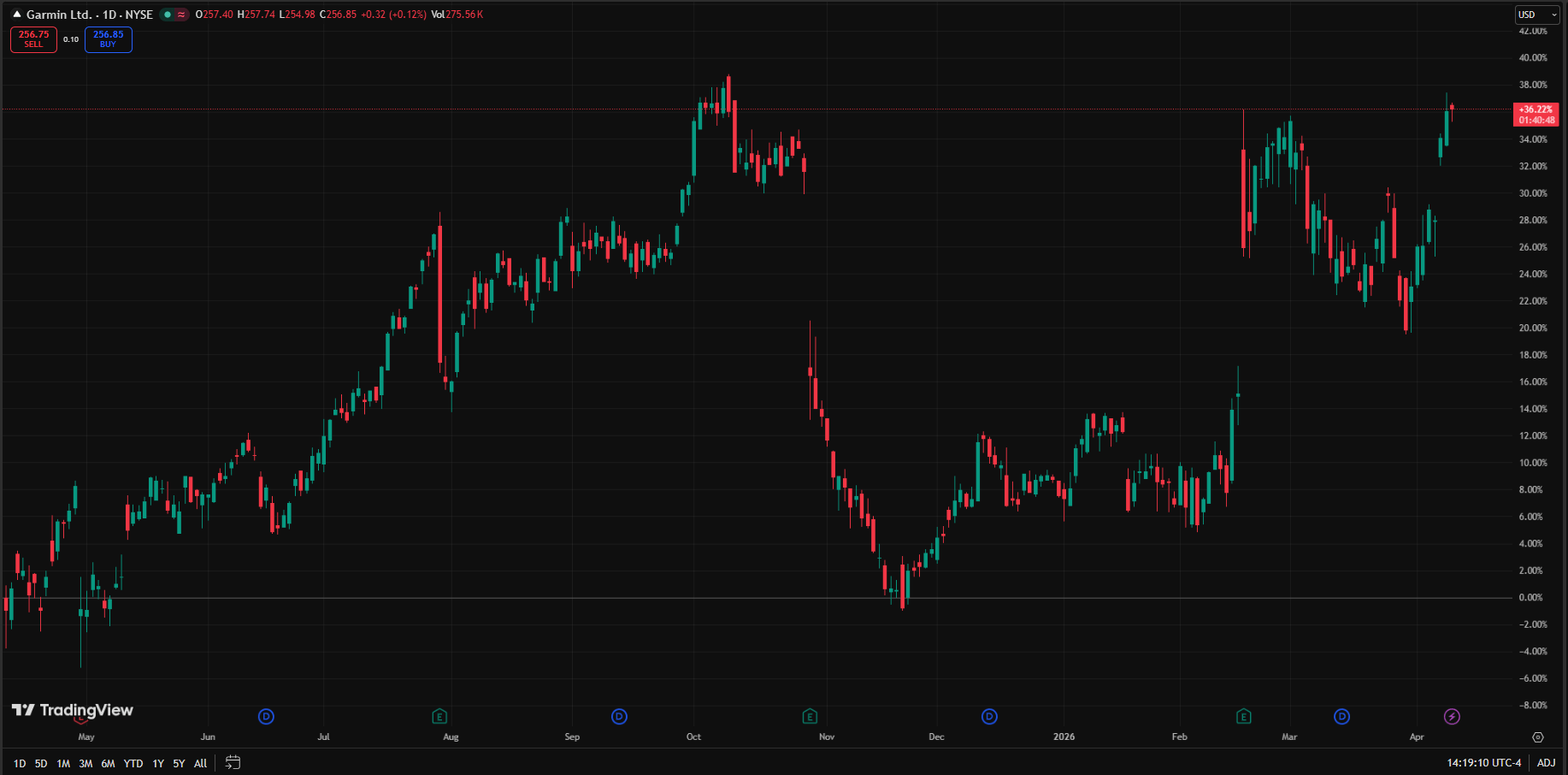 The Setup: Garmin is now pushing back above the $255 swing highs and approaching that critical October 2025 high.