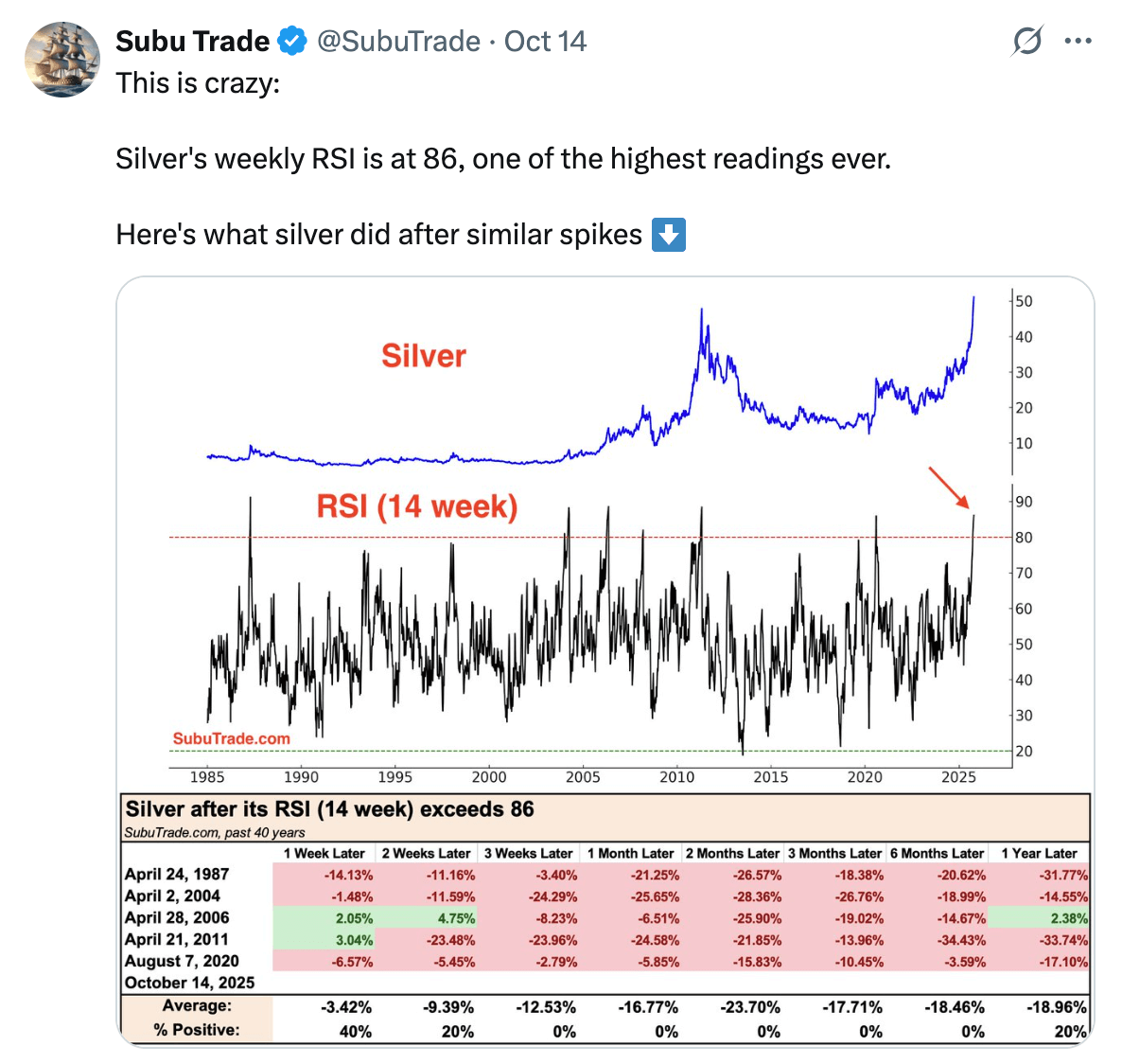 They point out that silver is the most overbought (as measured by weekly RSI) as it has been in the last 40 years.