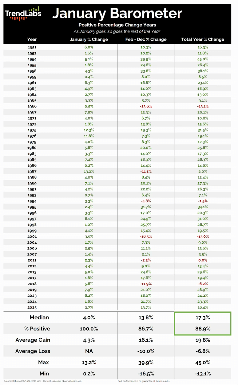 Historically, when the market finishes January higher, it has gone on to finish the full year higher nearly 89% of the time.