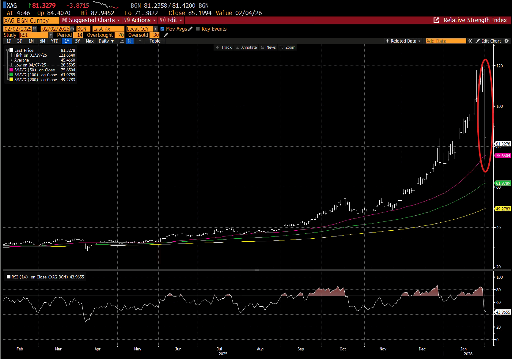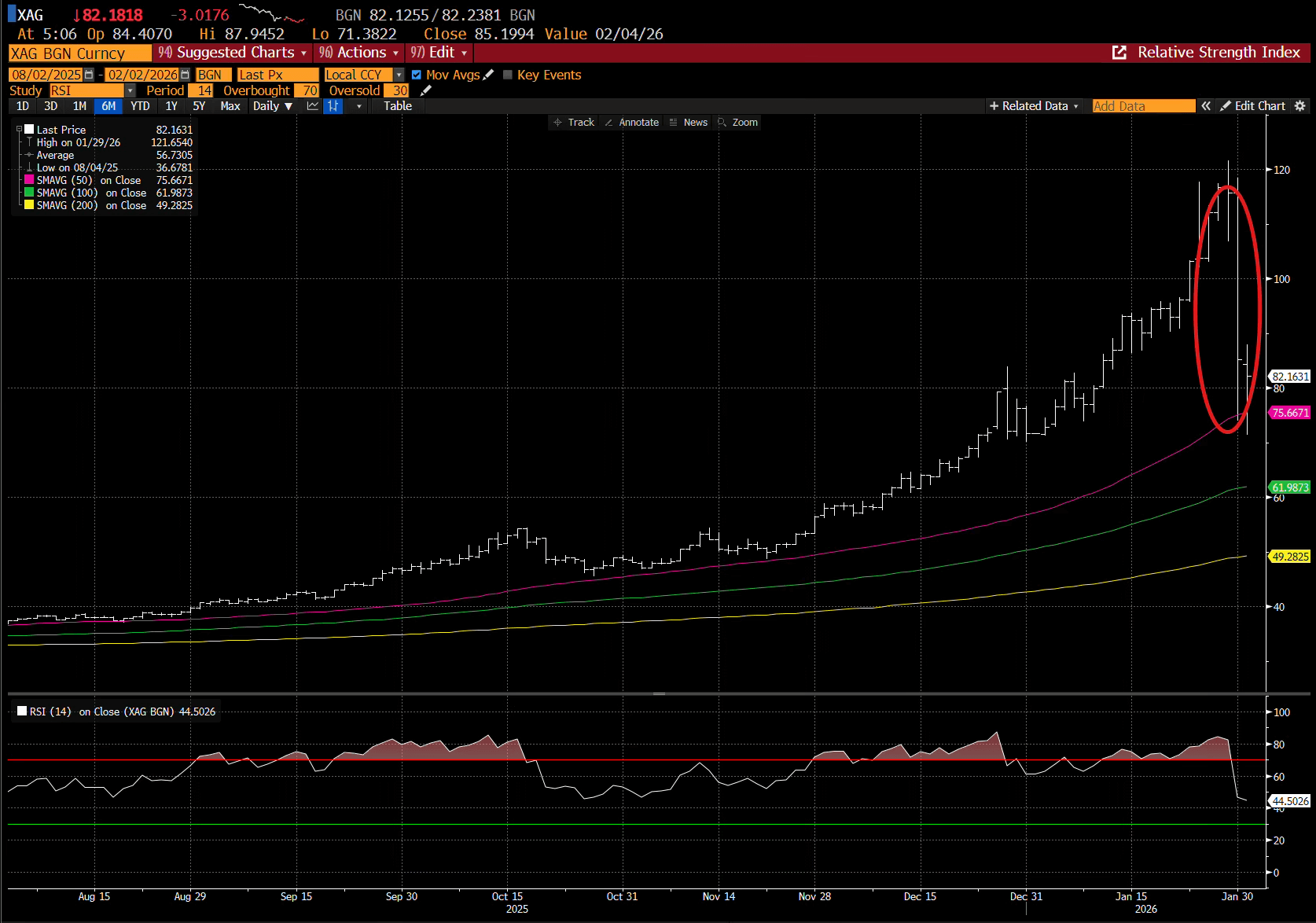 Silver was 60% above its 50-day moving average and 140% above its 200-day moving average — the largest amounts ever recorded.
