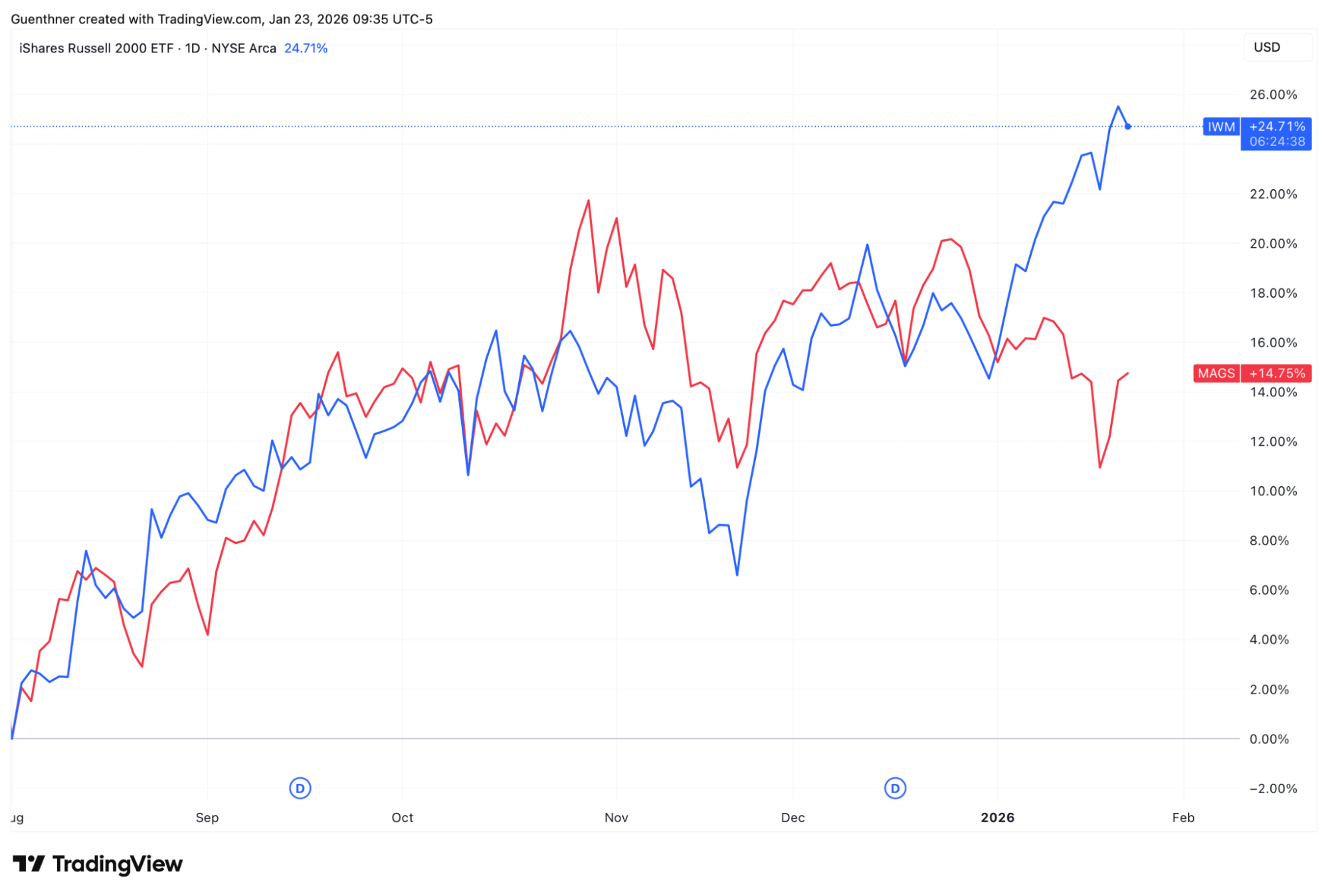 More importantly, smaller stocks are smoking the mega-caps. Just look at how IWM and the Magnificent 7 names have decoupled in January.