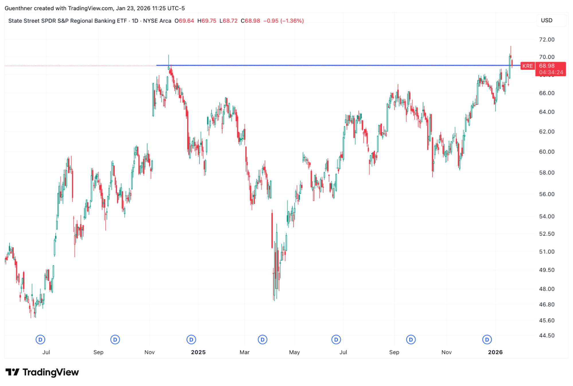 KRE is retesting a major breakout level near $70 heading into the weekend (it has just broken above this mark earlier in the week for the first time since November 2024).