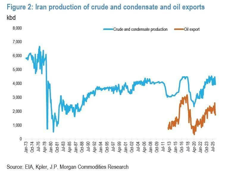 The chart below, compiled using data from the EIA, Kpler, and JPMorgan Chase, tracks Iran’s oil production versus its exports over time.