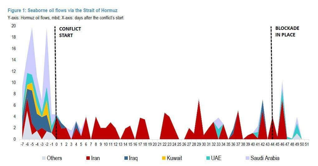 Below is a scenario model built by JPMorgan Chase that shows how oil flows through the Strait of Hormuz could behave after a conflict.