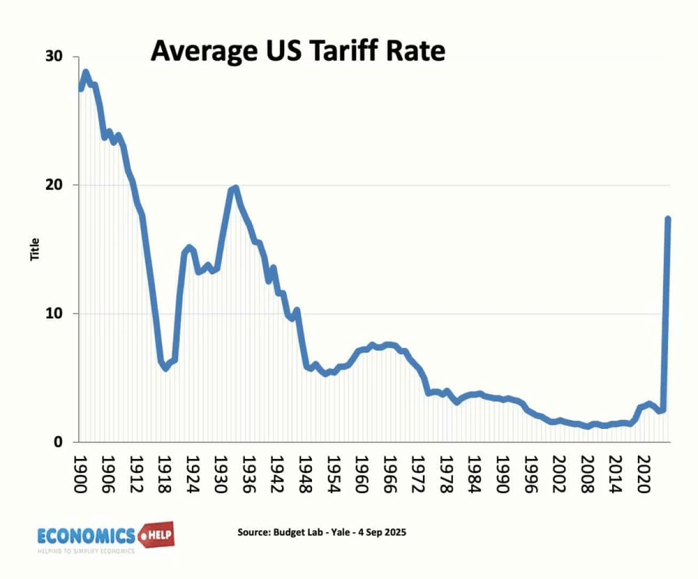 Take a look at the chart below, which shows the average U.S. tariff rate going back to 1900.