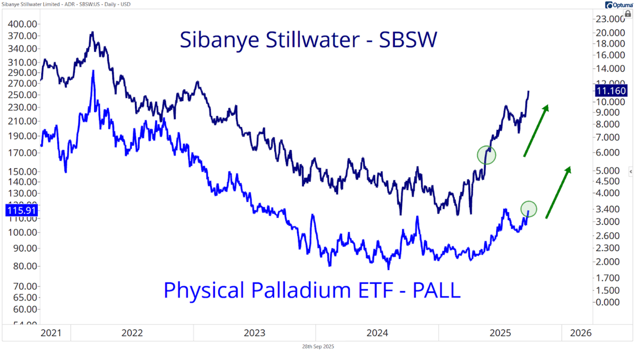 Sibanye has reversed sharply higher, joining gold and silver's rally with explosive momentum. Meanwhile, the palladium ETF has barely budged.