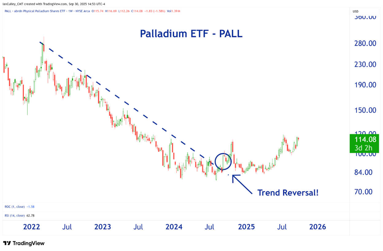 Last September, PALL violated a three-year downtrend line with authority. The bulls drove prices 17% higher that week—the largest weekly gain of 2024. These singular thrusts, whether on weekly, daily, or even intraday charts, often mark the beginning of a new trend.